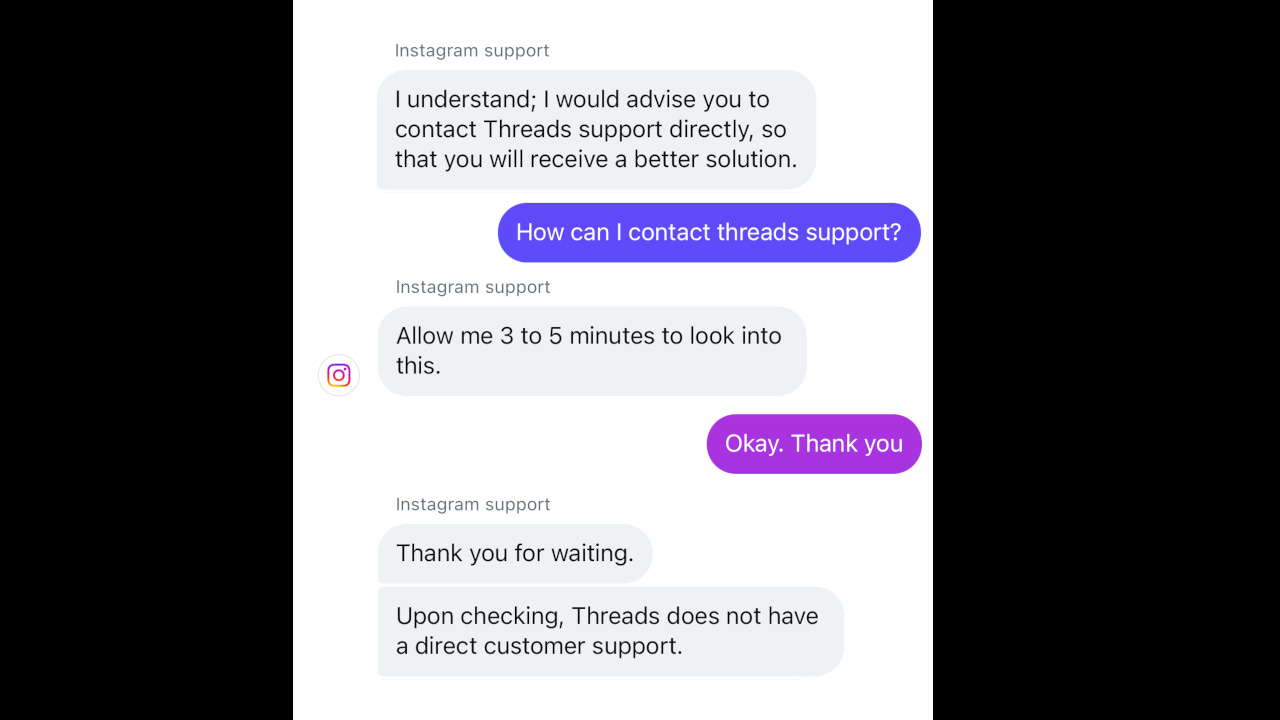 “Thank you for waiting. Upon checking, Threads does not have a direct customer support.”
